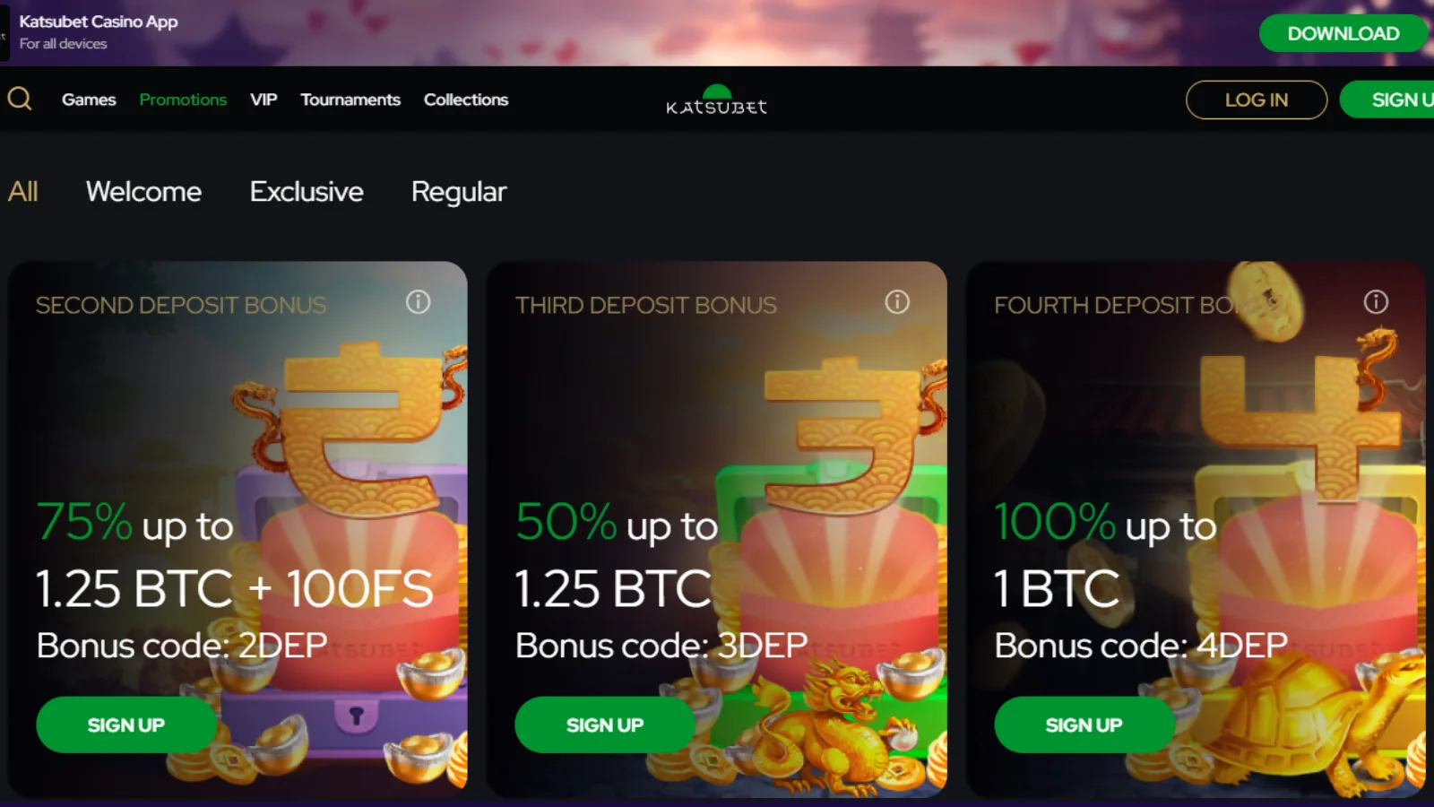After creating an account and completing the verification process, Katsubet welcomes you with a mouth-watering welcome bonus package. It is split between the first four deposits you make. To get any of these bonuses you have to make a minimum deposit of A$40.