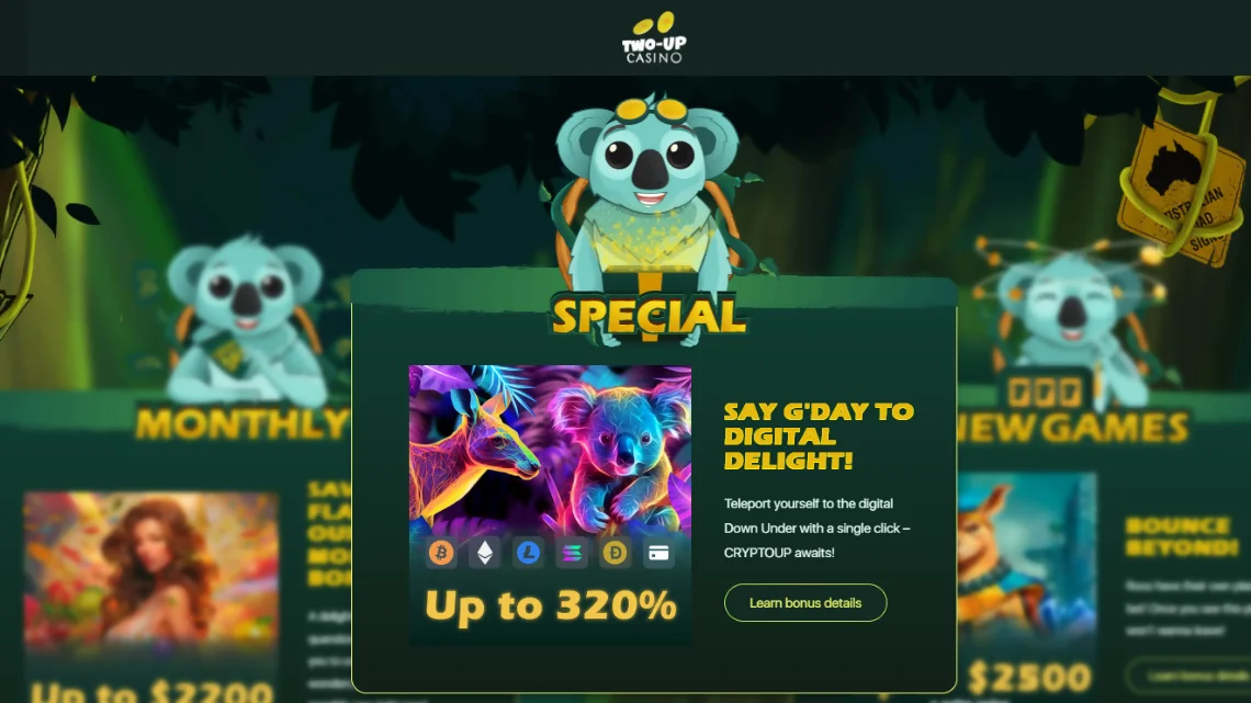 | 1 Two Up Casino | 200% up to AU$4 000 Bonus code : KOALAFUN KANGAHOP (after KOALAFUN) Code copied Min Dep AU$25 Wager x30 |