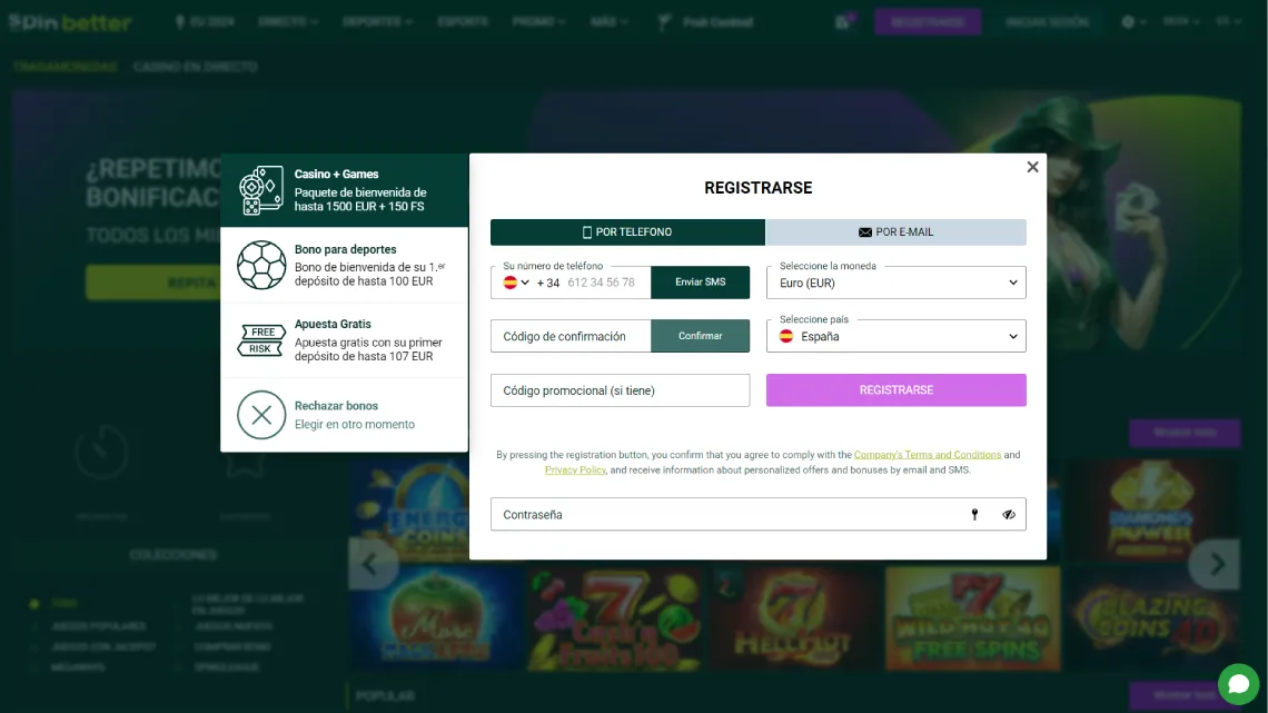 Hablando de ofertas, nuestro equipo descubrió que registrarse en SpinBetter implica acceder a uno de los casinos que ofrecen bonos de bienvenida. Se trata de un paquete de hasta 1500 EUR + 150 FS distribuido de la siguiente manera: