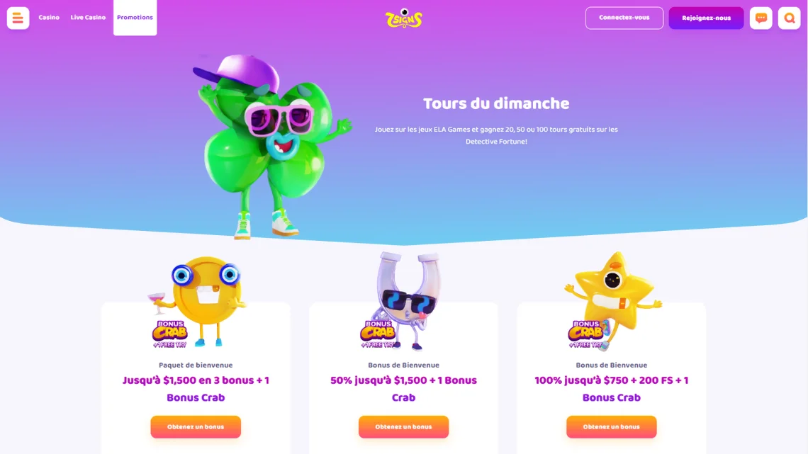 Le deuxième bonus est de 50% sur votre premier dépôt jusqu’à 1500 CAD ou 1000 €. Le troisième bonus est de 100% jusqu’à 750 CAD ou 500 € + 200 tours gratuits + 1 bonus crab. Le quatrième bonus est de 150% jusqu’à 112 CAD ou 75 € + 1 bonus Crab. Le cinquième bonus au choix vous donne droit à 3 tours gratuits dès un dépôt de 1,5 CAD ou de 1€. Le sixième bonus est un cashback de 15% sur les jeux en direct, dans la limite de 385 CAD ou 250 €. Enfin, le septième bonus au choix est un cashback de 10% sur tous les jeux, dans la limite de 300 CAD ou 200 €.