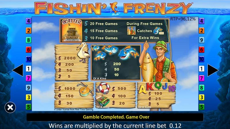 The payout percentage to the player in the Fishin’ Frenzy slot is 96.12%. Actually, this is an average value for virtual slots, which provides a pretty good chance of winning a prize. At the same time, high volatility indicates the instability of the gameplay.